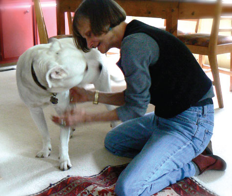 Jimmy is a part Pit Bull/Lab who was rescued from the streets of Seattle about seven years ago. He now lives on Vashon Island, where he loves to run madly on the beach, especially after about 30 seconds of immersion in the icy waters of Puget Sound. Sort of a “Yikes!” reaction that can take him into about 3 minutes of joyful romping. An occasional ball thrown down the hall will also cause a thrill, but otherwise, he’s a pretty sedate sort of guy.